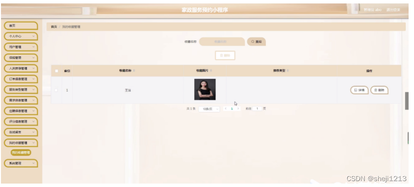 我的收藏管理,在我的收藏管理页面可以查看收藏名称、收藏图片、推荐类型等信息,并可根据需要对我的收藏管理进行详情,修改或删除等操作,如图5-11所示。