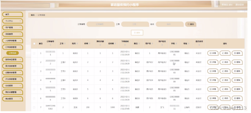 订单信息管理,在订单信息管理页面可以查看订单编号、工号、姓名、价格、预约天数、总价格、下单时间、备注、用户名、用户姓名、手机、地址、是否支付等信息,并可根据需要对订单信息管理进行修改或删除等操作,如图5-6所示。