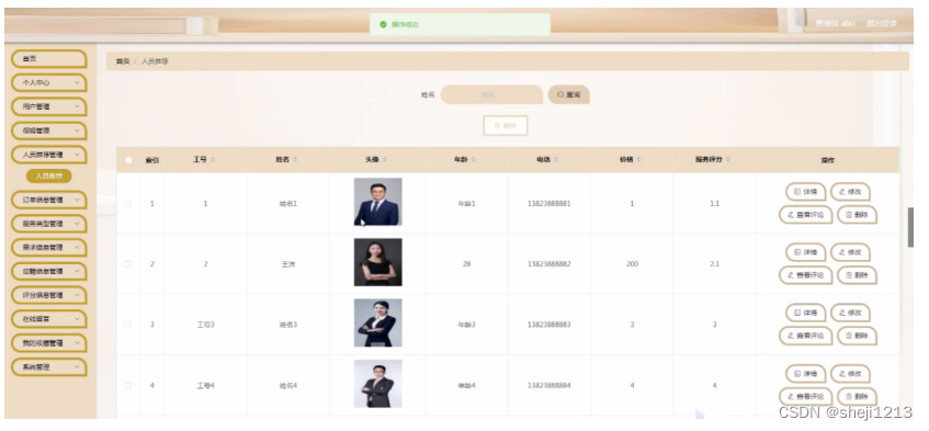 人员推荐管理,在人员推荐管理页面可以查看工号、姓名、头像、年龄、电话、价格、服务评分等信息,并可根据需要对人员推荐管理进行修改或删除等操作,如图5-5所示。
