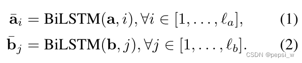 如下所示,使用表示BiLSTM对输入句子a在时间步i的隐藏状态,对b也同理。