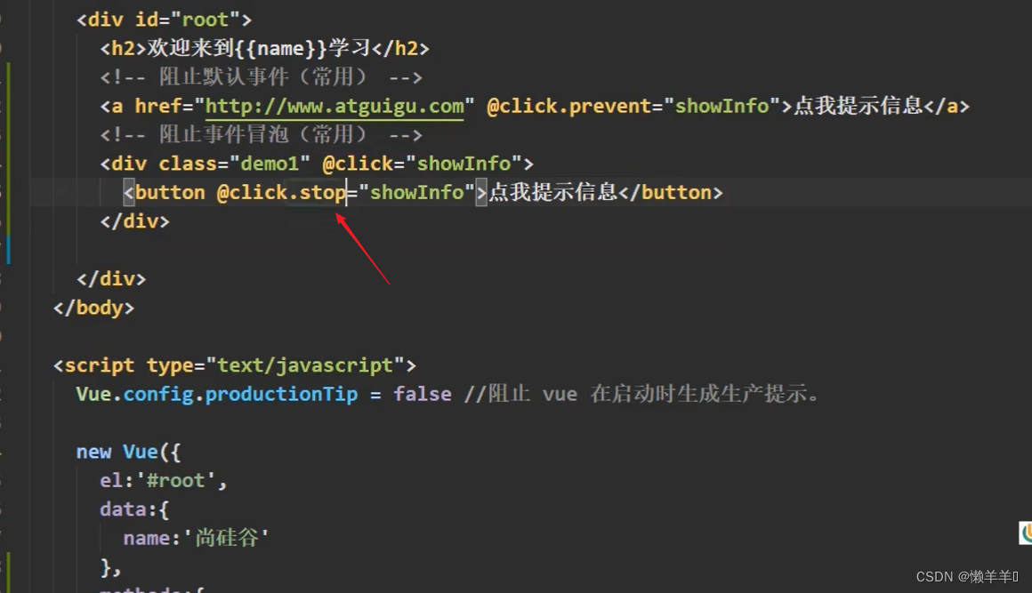 效果就是当点击button按钮的时候,会提示信息两次,这时就可以使用stopPropagation修饰符