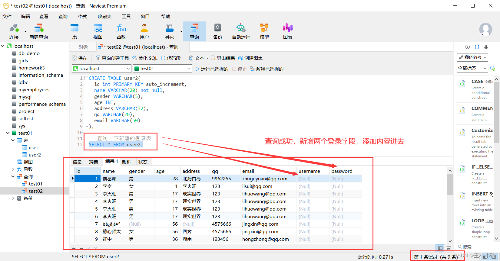 //1.设置编码request.setCharacterEncoding("utf-8");//2.获取参数Mapmap = request.getParameterMap();//3.封装对象User user = new User();try {BeanUtils.populate(user,map);} catch (IllegalAccessException e) {e.printStackTrace();} catch (InvocationTargetException e) {e.printStackTrace();}//4.调用service方法报错UserService service = new UserServiceImpl();service.addUser(user);//5.跳转到/userListServlet // 没有共享数据使用重定向 加上虚拟路径request.getContextPath()response.sendRedirect(request.getContextPath()+"/userListServlet"); UserDaoImpl中的addUser方法也优化了@Overridepublic User addUser(User user) {try {//第一版 //String sql = "insert into user2 set name = ?, gender = ?, age = ?, address = ?, qq= ?, email = ?";//第二版String sql ="insert into user2 values(null, ?, ?, ?, ?, ?, ?,null, null )";template.update(sql, user.getName(), user.getGender(), user.getAge(), user.getAddress(), user.getQq(), user.getEmail());} catch (DataAccessException e) {e.printStackTrace();}return user;}添加用户成功!