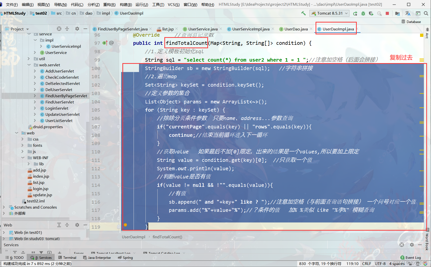 @WebServlet("/addUserServlet") public class AddUserServlet extends HttpServlet {protected void doPost(HttpServletRequest request, HttpServletResponse response) throws ServletException, IOException {//设置request编码request.setCharacterEncoding("utf-8");//调用UserService完成添加UserService service = new UserServiceImpl();//获取参数String name = request.getParameter("name");String gender = request.getParameter("gender");int age = Integer.parseInt(request.getParameter("age"));String adress = request.getParameter("address");String qq = request.getParameter("qq");String email = request.getParameter("email");//添加到User里User user = new User();user.setName(name);user.setGender(gender);user.setAge(age);user.setAddress(adress);user.setQq(qq);user.setEmail(email); // 调用UserService层User user1 = service.addUser(user);// 将list存入request域request.setAttribute("user1",user);//转发到request.getRequestDispatcher("/index.jsp").forward(request,response); 3.调转到重新查询的servlet // response.sendRedirect(request.getContextPath()+"/userListServlet");}protected void doGet(HttpServletRequest request, HttpServletResponse response) throws ServletException, IOException {this.doPost(request, response);} }后来加入了工具类,效率提高