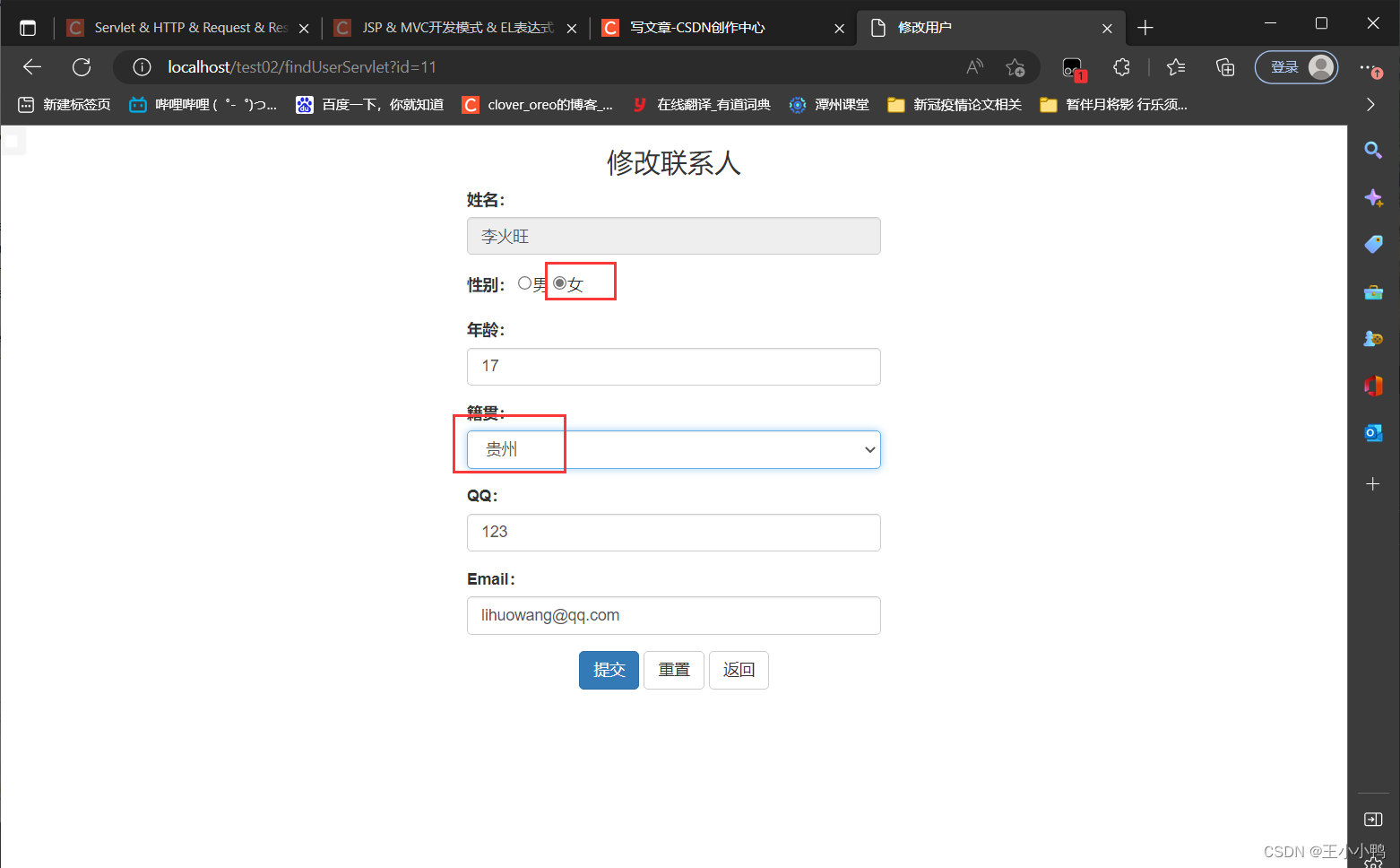 会发现性别和籍贯因为是有默认选择的复选框,不是手动输入的数据,所以未被存储进去,需要在UserAddServlet里添加存储进去,这样选择框里的对象也能获取到