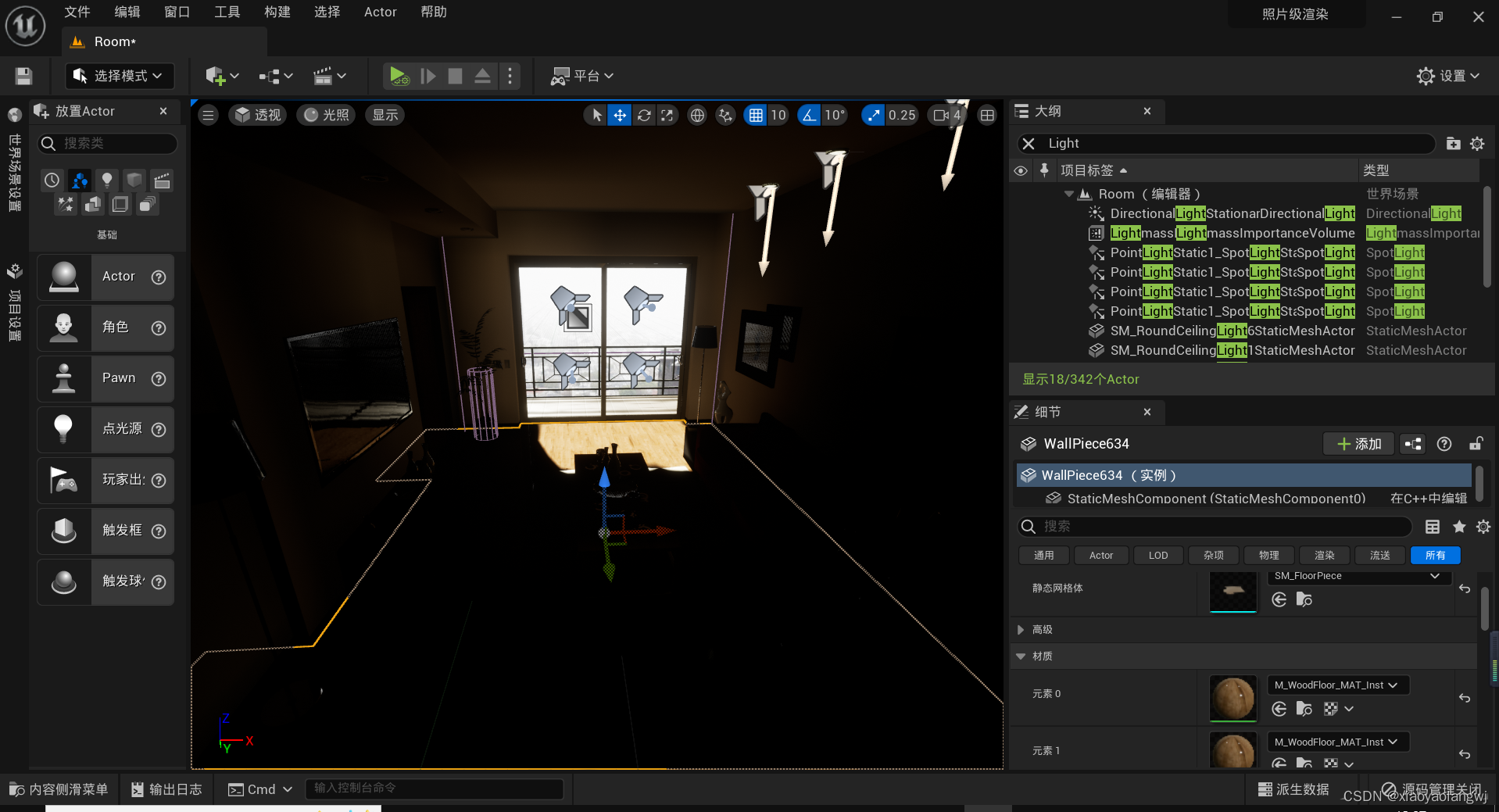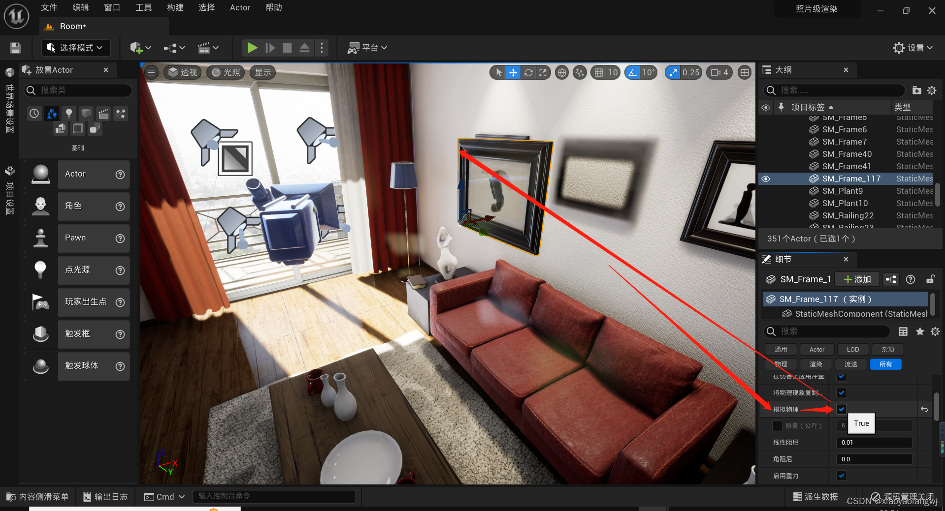 将墙上的一个相框从墙上移动出来。然后可以看到墙上留有就像是火烧过的痕迹。这就是光照中提到的Baked。是因为光照中我们选择了静态光照产生的。