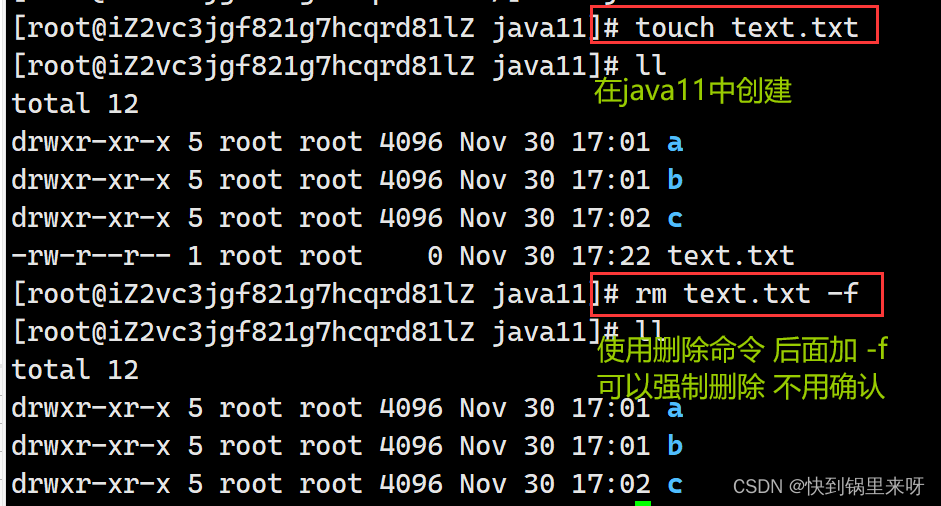 - rm 文件名 (加 -f 强制删除,不提示; rm -rf 目录,直接递归删除目录) 删除文件/目录