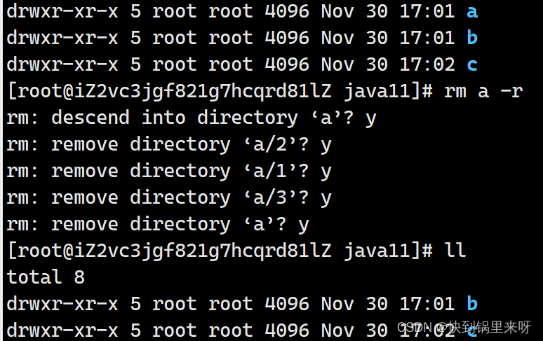 rm 删除目录,需要指定 -r 选项, r表示递归 目录里面可能包含文件也可能包含子目录,子目录里还有孙子目录, 删目录,不是只删这一个,而是把下面整体的所有的子树结点都删除了