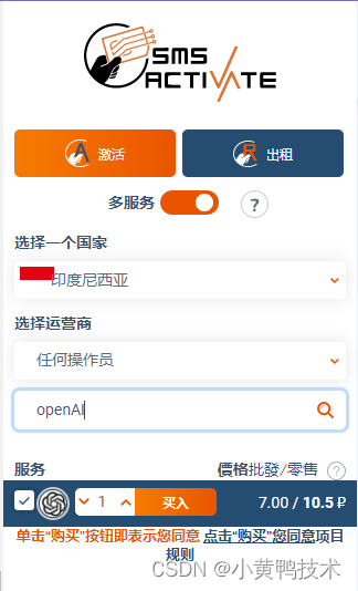 3.我选择的是印度尼西亚,搜索openAI点击买入,这样你就会受到一个手机号,放入openAI中需要手机号的地方,!注意,需要把前面地区的代码62去掉,OpenAI中手动选择印度尼西亚,把手机号放入。