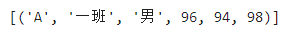 data = [('B', '一班', '女', 78, 87, 85),('C', '一班', '男', 98, 84, 90),]