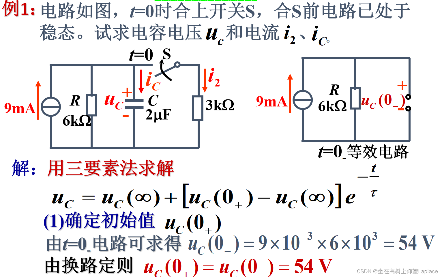 关于结论2,在0-的那一瞬间,因为没有储能,u_{C}=0,所以电容看作短路,i_{L}=0,所以电感看作开路。