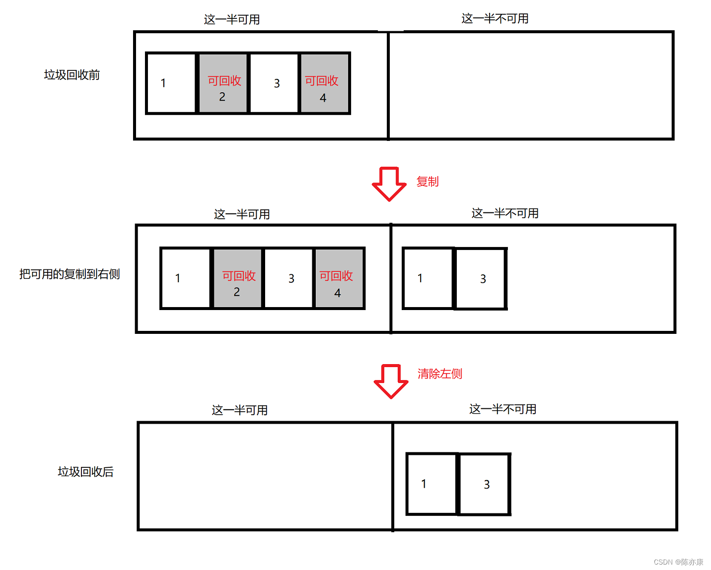 具体的,将内存分成两块大小相等的空间,但只使用其中的一块,当需要进行垃圾回收时,就把正在使用的那块空间上还存活的对象复制到另一块上,再将使用过的那块内存全部清空;这样做的好处就是不用在考虑内存碎片问题;