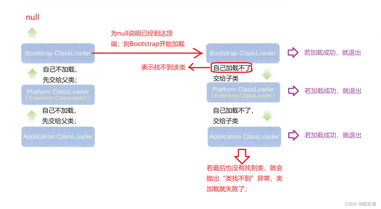 一个类加载器收到类加载请求,首先自己不会加载这个类,而是把这个请求委派给父类加载器完成,每一层都是如此,因此所有加载请求最终都会送到最顶层的加载器中,只有父加载器反馈无法加载这个请求,子类才会尝试去加载;