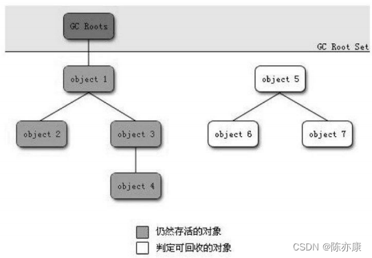 上图中,通过 GC roots就可以找到object1、object2、object3、object4;而object5、6、7则不可以被访问到,所以5、6、7就是垃圾了;