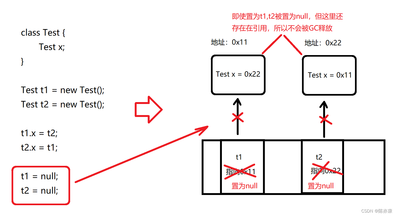 当前这两个对象引用计数器为1,因为即使t1, t2两个引用被置为空,但实际上时两个对象在相互引用,此时外界代码是无法访问的,但由于引用计数器不是0,所以无法进行释放;
