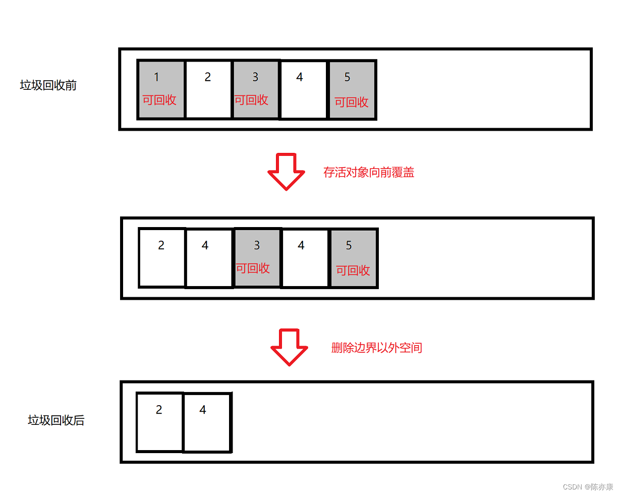 标记过程与 “标记-清除算法”一致,但后续步骤不是直接对可回收对象进行清理,而是让所有存活对象都向一端连续性的覆盖,然后直接清除掉边界以外的空间;(类似于顺序表的删除元素)