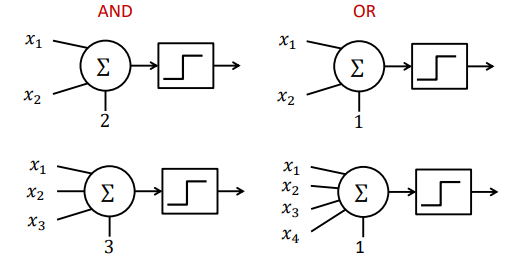 比如一组数据 0 0 1 0,合取为0,析取为1,我们只需分别把阈值设置为4和1即可: