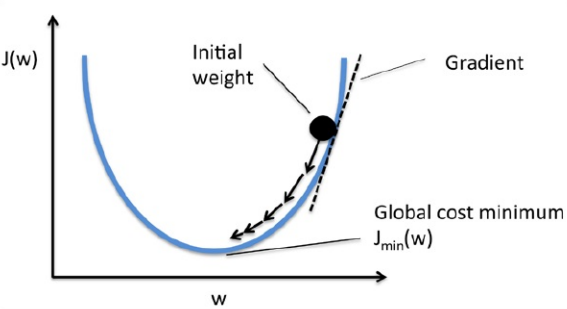 - 另一个很好的特性是Adaline的损失函数是凸函数,因为,我们可以使用简单而有效的优化算法:梯度下降(gradient descent)来找到使损失函数取值最小的权重参数。