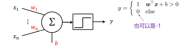 之前我们输入的都是逻辑单元01,这次x可以为实数,对x进行加权(w),求和,与阈值(b)进行比较,同样大于的取1,不大于的取0或者-1。