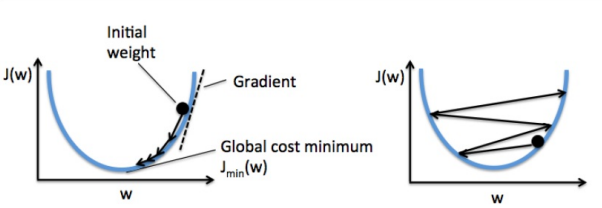 下面左图展示了权重再更新过程中如何得到损失函数 J(w) 最小值的。右图展示了学习率过大时权重更新,每次都跳过了最小损失函数对应的权重值。
