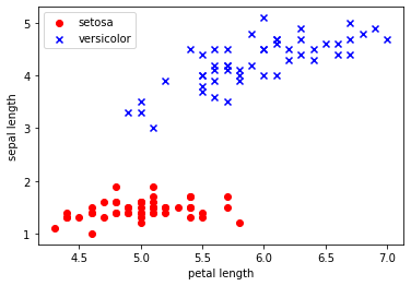 import matplotlib.pyplot as pltplt.scatter(X[:50,0],X[:50,1],color='red',marker='o',label='setosa') plt.scatter(X[50:100,0],X[50:100,1],color='blue',marker='x',label='versicolor') plt.xlabel('petal length') plt.ylabel('sepal length') plt.legend(loc='upper left') plt.show()