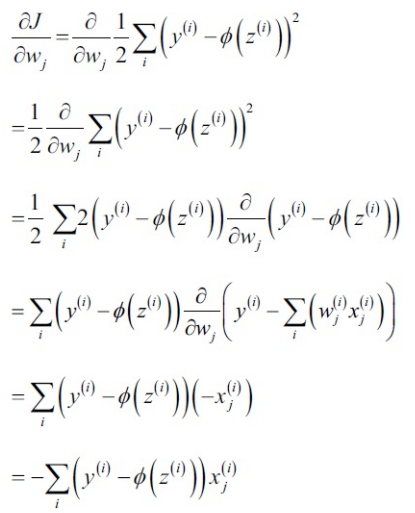 - 相对于感知机中的单位阶跃函数,使用连续现行激活函数的一大优点是Adaline的损失函数是可导的。