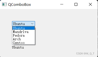 本例包含了⼀个 QComboBox 和⼀个 QLabel 。下拉选择框有五个选项,都是Linux的发行版名称,标签内容为选定的发行版名称。