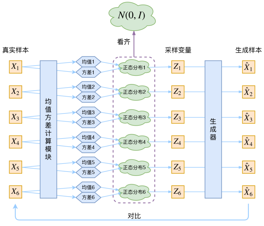 学其分布,就是学习均值和方差,怎么学习呢,神经网络就是一种方法,知道了分布,就可以采样到对应的,再对训练个生成器,输入,生成,让和尽可能接近。要生成数据的时候,根据学习到的分布随机采样,输入生成器即可生成接近真实样本的数据。要进一步学习细节请移步苏神文章。