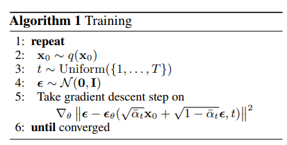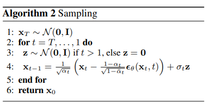 ,推理(由噪声生成想要的数据)就简单了,从N(0,1)中随机生成一个噪声,循环T步逐步去噪,就从噪声恢复得到了,算法描述为: