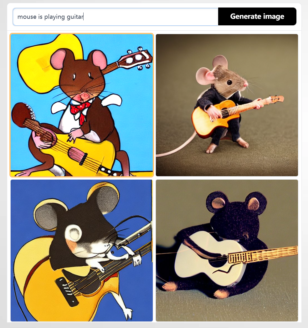 下面是我在Stable Diffusion中输入“mouse is playing guitar”生成图片的例子,花了25秒,效果不错,关键还是免费的效果。我也尝试了在中文版网站输入中文,但网页没反应,估计系统暂时有问题。