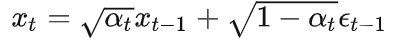 是预先设定好的超参数,是高斯噪声,由t到t-1的不断迭代,可以得到,其中,也是一个随机高斯噪声,于是t时刻的值可以由0时刻初始值计算得到。具体迭代有一堆推导,此处省略。