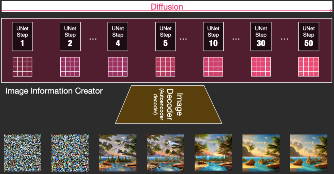 具体扩散过程如下,由50步UNet扩散步骤组成。结合我们本文扩散模型的知识,先随机产生一个噪声数据,加上文本embedding的条件,经过50步的扩散去噪过程,最终就能生成满足文本要求的图片数据。图片数据通过Image Decoder解码器生成图片就不是重点了。