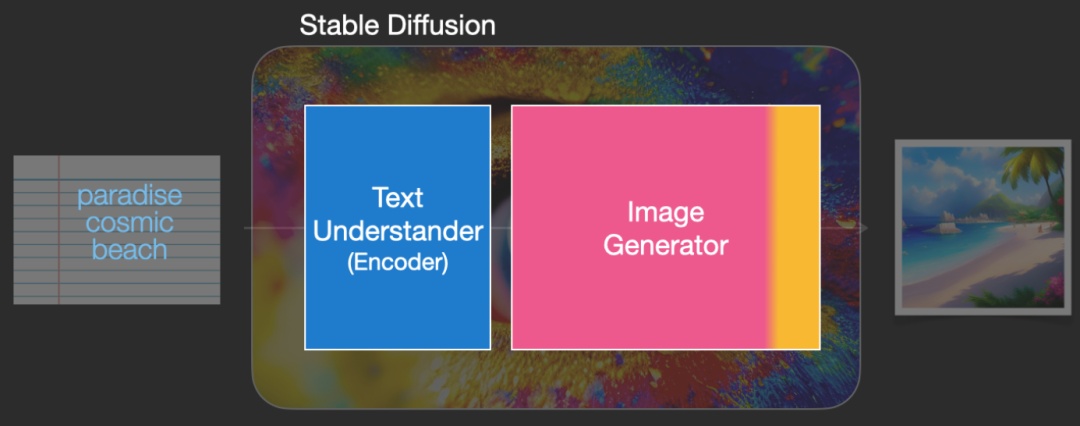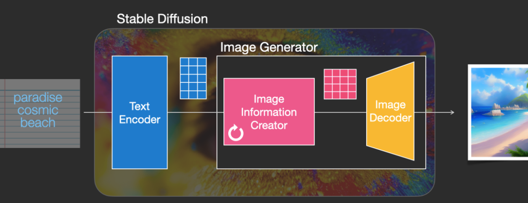 总体结构很清晰,输入一段文字,通过Stable Diffusion输出这段文字描述的一张图片,比如上图输入“极乐美丽的沙滩”,输出就是这么一张美丽的沙滩图片。模型由两个组件构成,一是Encoder把文字转换为对应的embedding/representation,这个是NLP文本处理的常规操作,有了文本的embedding,第二个组件Image Generator把这个embedding转换生成图片。论文中说,使用较大的语言模型生成更好的embedding对生成的图像质量的影响大于使用较大的图像生成组件。