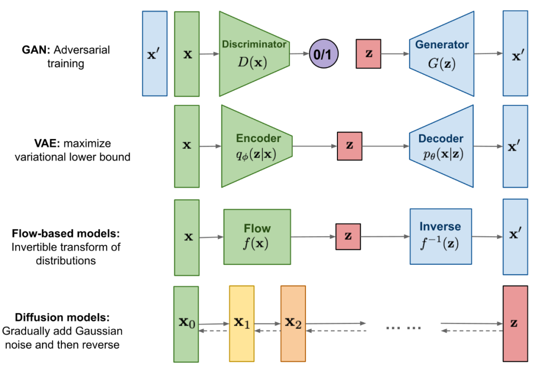 上图是各种资料中常引用来比较GAN、VAE、Flow-based、Diffusion模型的一个经典图,Flow-based模型我没有研究过,直接从GAN、VAE说起,不妨碍我们的理解。