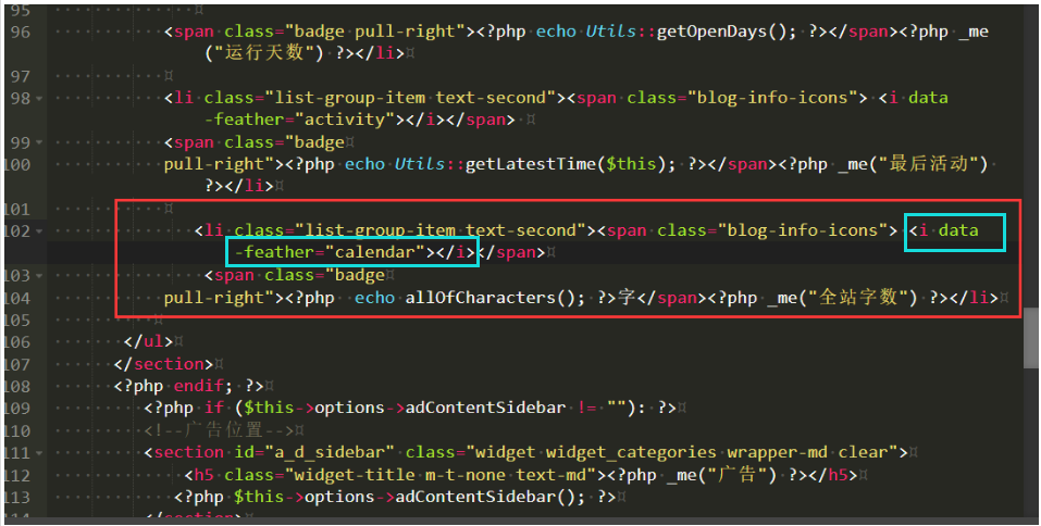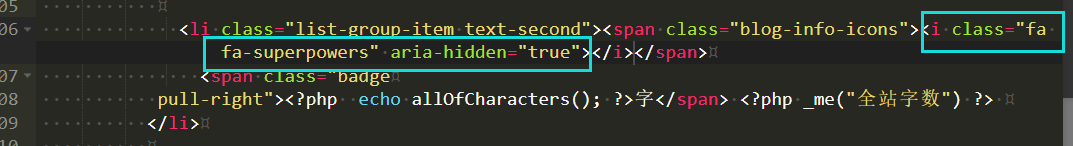 如下图所示代码:蓝色框所圈中的代码是用来控制矢量图标文字的,矢量图标文字就是"全站字数"左边显示的那个图标