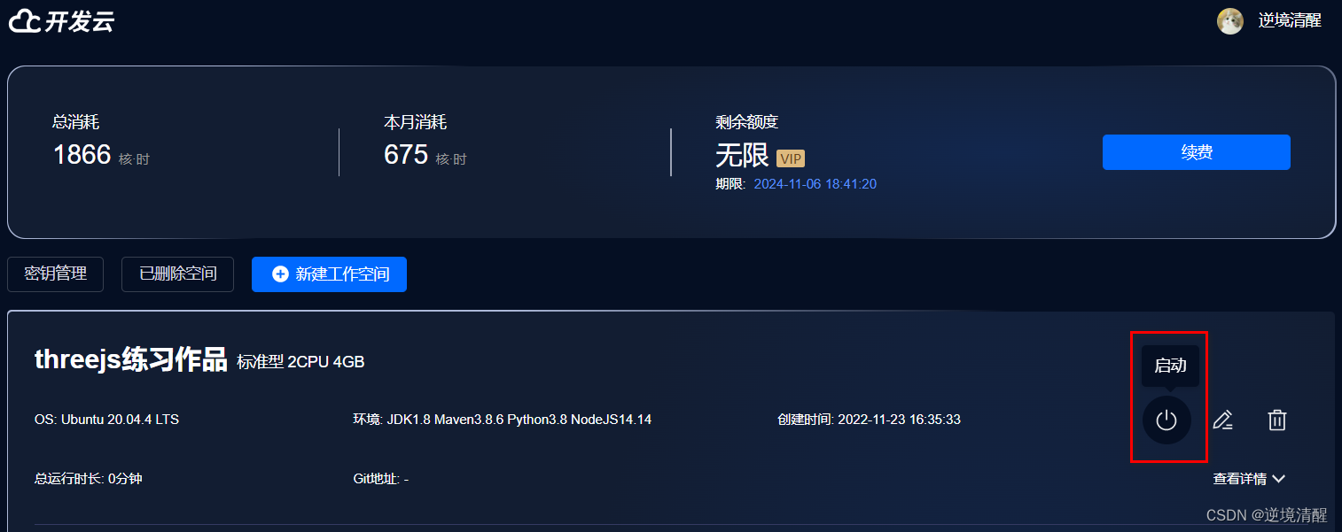 点击所建立的工作空间右侧的【启动】按钮,可以启动工作空间。