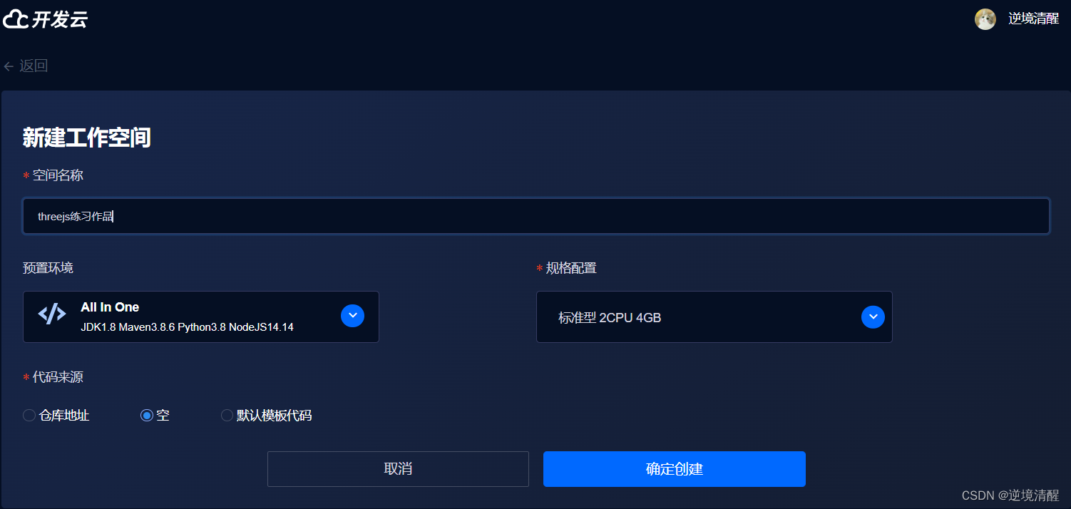 (1.1)、在这里需要填入工作空间名字,填写你的工作空间名字。我个人填的是【threejs练习作品】。