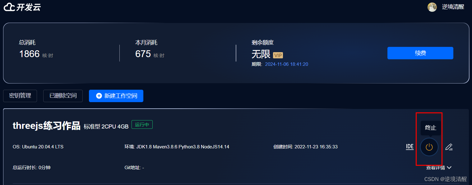 如果有事忙,想等会再用IDE,可以先回到云IDE首页,按右侧的【终止】按钮,将云IDE停止,这时会停止消耗计时(免费时间是2000核时,请合理安排好学习时间)。