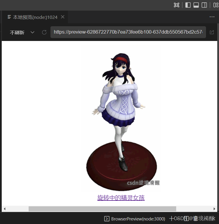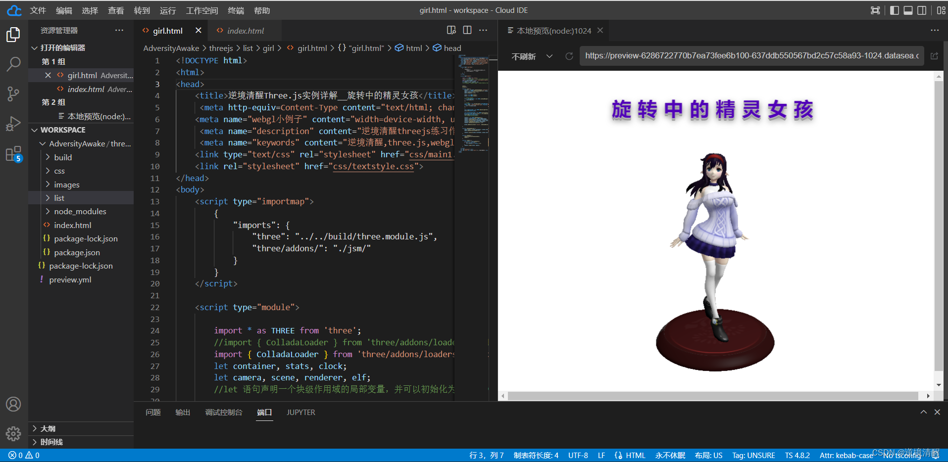 项目构建好以后,可以直接运行打开【旋转的精灵女孩】 Three.js实例。