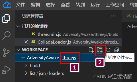 ①、选好父级目录,选中,这时目录结构下面会出现一条下划线,例如选中AdversityAwake目录下的threejs目录,threejs目录名显示成:threejs