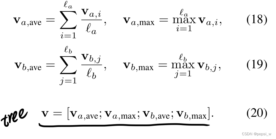 在ESIM中依旧使用BiLSTM对ma和mb的上下文信息进行捕获,计算与前面的公式1和公式2类似。另一个模型中,使用以下公式进行树节点的更新: