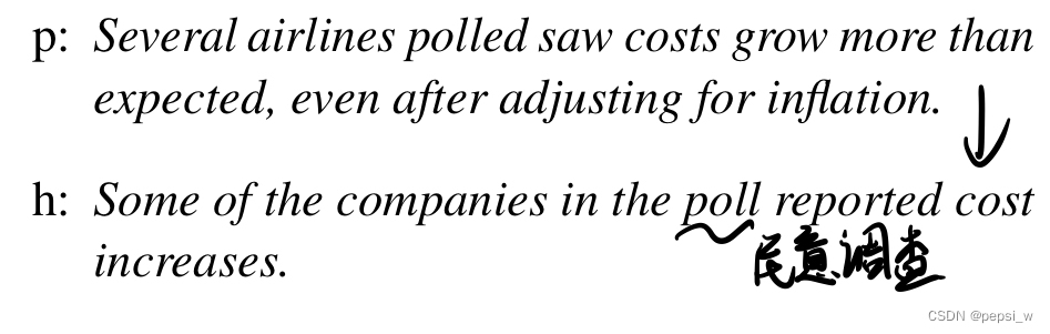 自然语言推理(NLI)中一个任务是RTE(recognize textual entailment),就是判断两个句子之间的关系,存在三种情况:矛盾、无关以及蕴含。实际就是看在给定前提p的情况下,能不能推出假说h。例如以下例子: