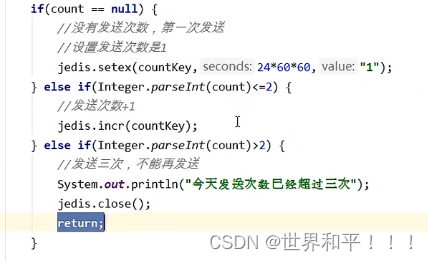 public void testLockLua() {//1 声明一个uuid ,将做为一个value 放入我们的key所对应的值中String uuid = UUID.randomUUID().toString();//2 定义一个锁:lua 脚本可以使用同一把锁,来实现删除!String skuId = "25"; // 访问skuId 为25号的商品 100008348542String locKey = "lock:" + skuId; // 锁住的是每个商品的数据// 3 获取锁Boolean lock = redisTemplate.opsForValue().setIfAbsent(locKey, uuid, 3, TimeUnit.SECONDS);// 第一种: lock 与过期时间中间不写任何的代码。// redisTemplate.expire("lock",10, TimeUnit.SECONDS);//设置过期时间// 如果trueif (lock) {// 执行的业务逻辑开始// 获取缓存中的num 数据Object value = redisTemplate.opsForValue().get("num");// 如果是空直接返回if (StringUtils.isEmpty(value)) {return;}// 不是空 如果说在这出现了异常! 那么delete 就删除失败! 也就是说锁永远存在!int num = Integer.parseInt(value + "");// 使num 每次+1 放入缓存redisTemplate.opsForValue().set("num", String.valueOf(++num));/*使用lua脚本来锁*/// 定义lua 脚本String script = "if redis.call('get', KEYS[1]) == ARGV[1] then return redis.call('del', KEYS[1]) else return 0 end";// 使用redis执行lua执行DefaultRedisScript redisScript = new DefaultRedisScript<>();redisScript.setScriptText(script);// 设置一下返回值类型 为Long// 因为删除判断的时候,返回的0,给其封装为数据类型。如果不封装那么默认返回String 类型,// 那么返回字符串与0 会有发生错误。redisScript.setResultType(Long.class);// 第一个要是script 脚本 ,第二个需要判断的key,第三个就是key所对应的值。redisTemplate.execute(redisScript, Arrays.asList(locKey), uuid);} else {// 其他线程等待try {// 睡眠Thread.sleep(1000);// 睡醒了之后,调用方法。testLockLua();} catch (InterruptedException e) {e.printStackTrace();}}
