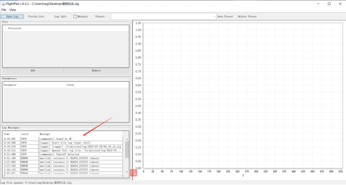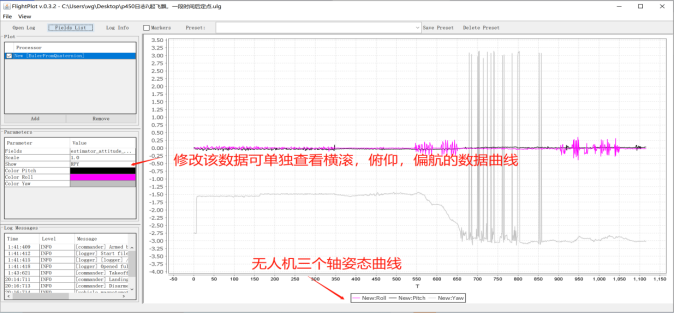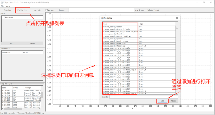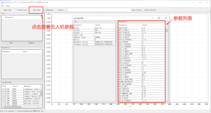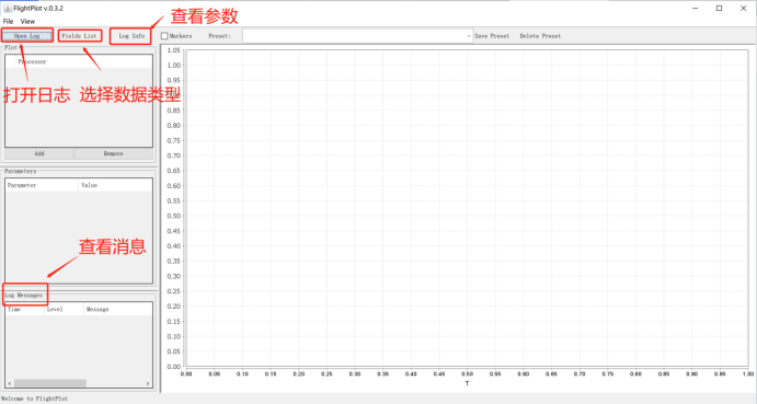 该软件的界面主要由四部分构成,分别是:打开日志(Open Log)、查看消息(Log Messages)、查看参数(Log Info)、选择数据类型(Fields List),如下图所示:
