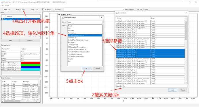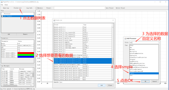 点击Fields List 选择想看的数据值,该项包含了许多日志信息,包括各种传感器信息。