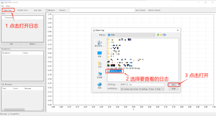 首先,点击Open Log可打开要查看的日志,下图为日志加载步骤,先点击Open Log,选择要查看的日志文件,再点击打开。