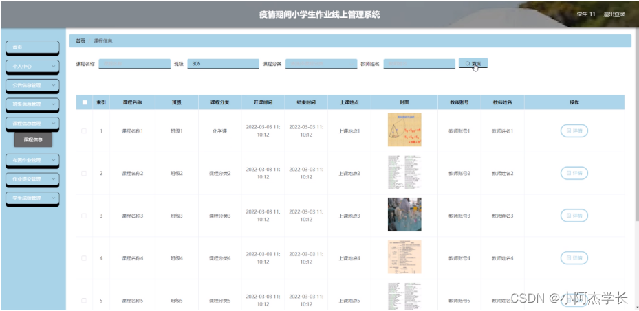 课程信息管理,在课程信息管理页面可以对索引,课程名称,班级,课程分类,开课时间,结束时间,上课地点,封面,教师账号,教师名称等内容进行详情操作,如图5-16所示。