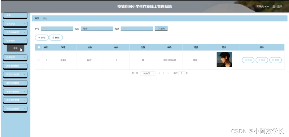 学生管理,在学生管理页面可以对索引,学号,姓名,年龄,性别,手机,班级,图片等信息进行详情,修改和删除等操作,如图5-6所示。