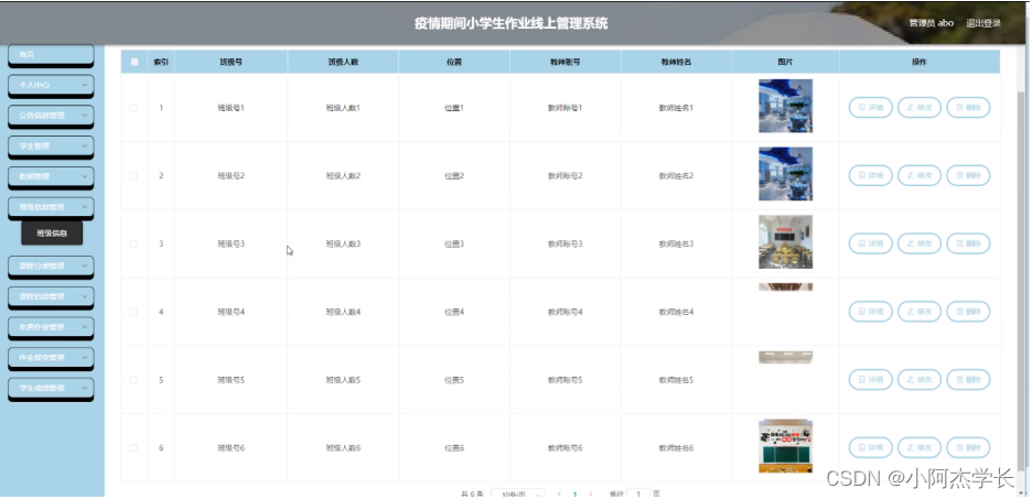 班级信息管理,在班级信息管理页面可以对索引,班级好,班级人数,位置,教师账号,教师姓名,图片等内容进行详情,修改或删除等操作,如图5-8所示。