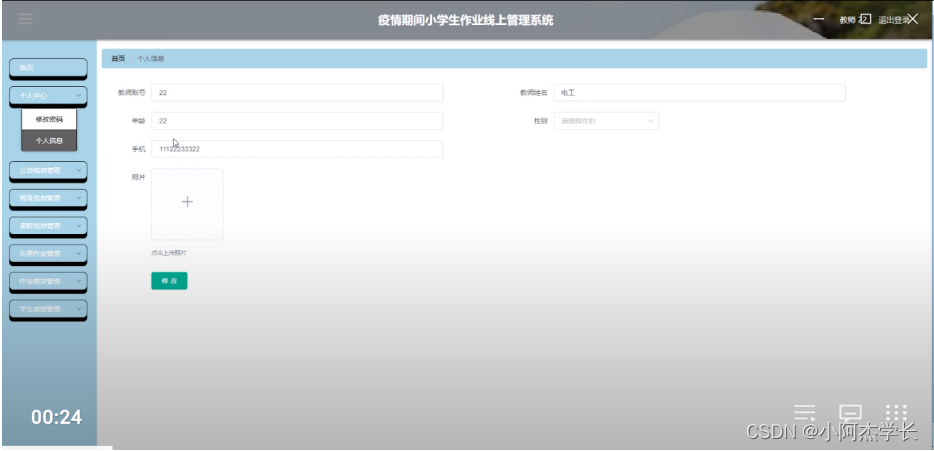 个人中心,在个人中心页面通过填写学号,姓名,头像,性别,手机,年龄,图片,班级等内容进行个人信息修改操作,如图5-15所示。