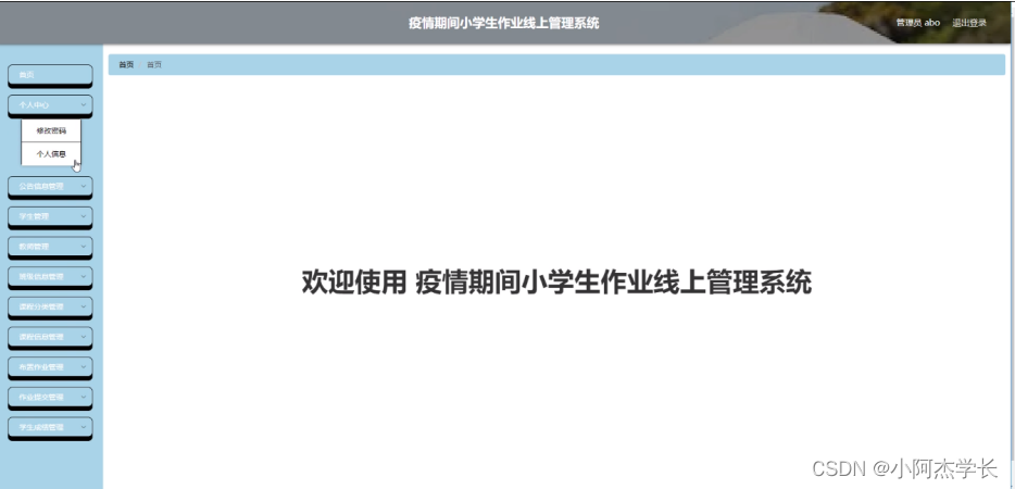 管理员登录系统后,可以对首页,个人中心,公告信息管理,学生管理,教师管理,班级信息管理,课程分类管理,课程信息管理,布置作业管理,作业提交管理,学生成绩管理等功能进行相应的操作管理,如图5-4所示。